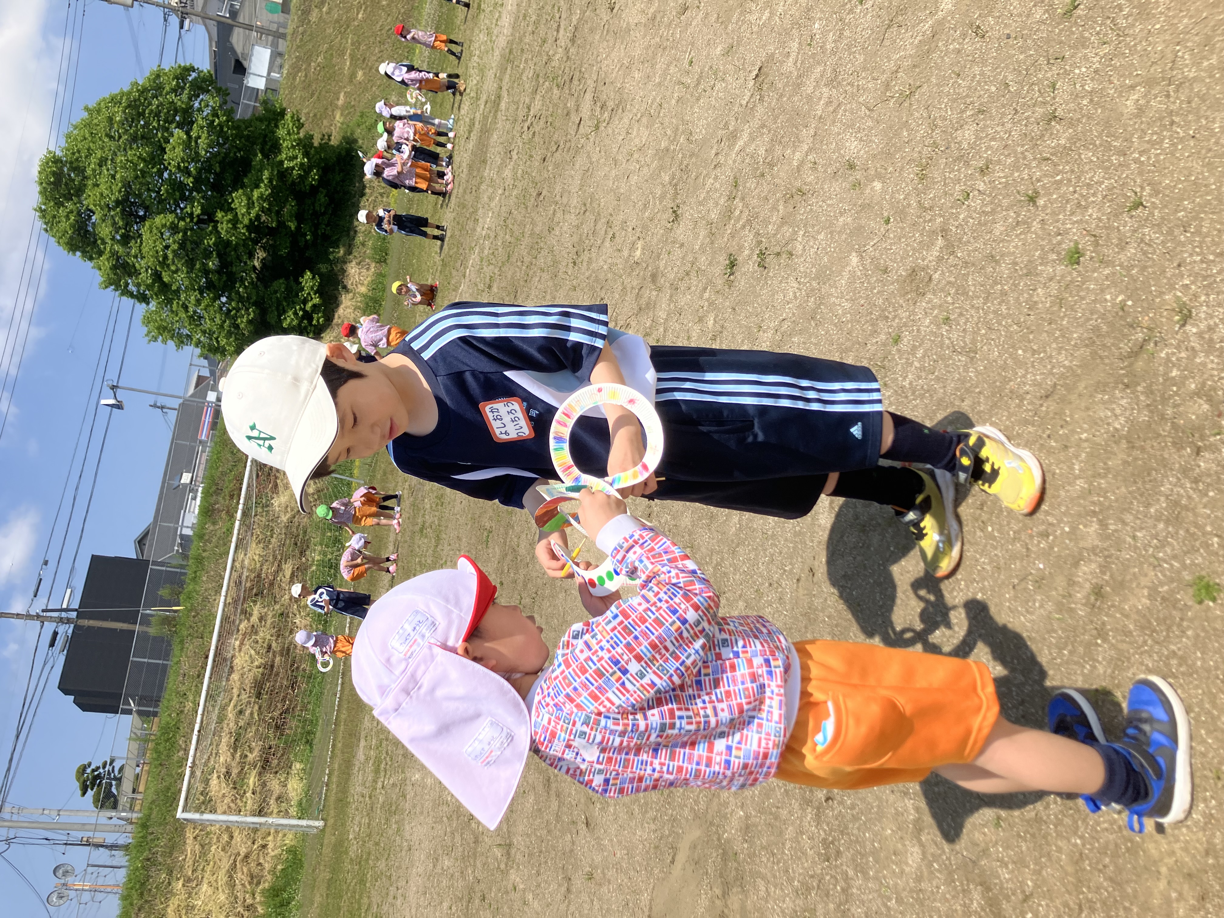 風車がうまく回らない年長さんに、優しく教えてあげることや、手をつないで並ぶ場所を教えてあげることもできました。